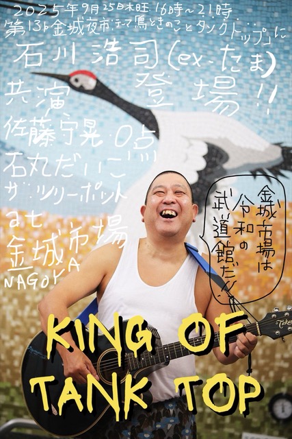 ゆえに今回の金城夜市で「キング・オブ・タンクトップ」と称される石川浩司氏がステージに立つことは、人類の代表としてステージに立つことに等しい。そして氏がかつて在籍した「たま」の黙示録的傑作「さよなら人類」に思いを巡らすのであれば、誰もが深甚な感傷とともに「ありがとう金城夜市」と思うに違いない。事実、今まさにブラインドタッチで本文を打っている筆者もまた、滂沱の涙と鼻水そして唇から涎をダダ漏れさせていることを隠すつもりはない。