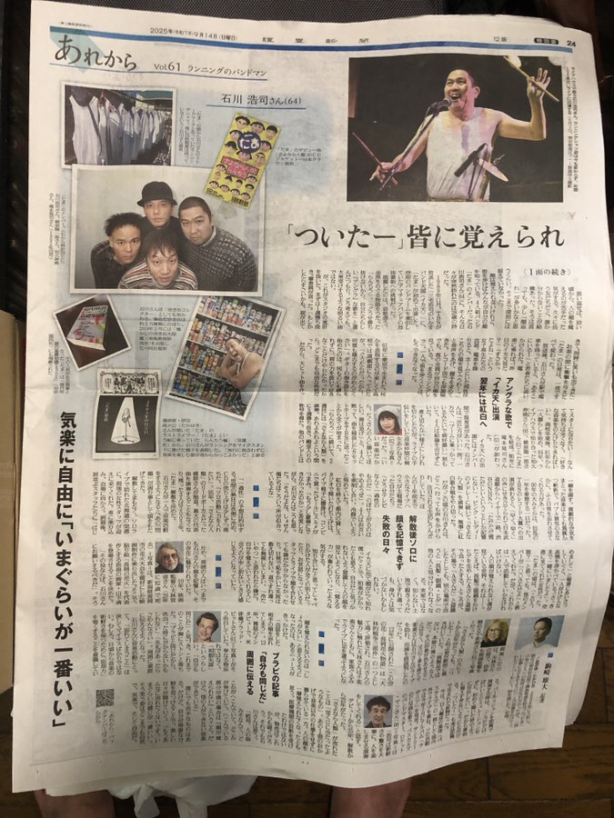 本日の読売新聞に一面まるごと。本当は他のメンバーの話も聞きたかったけど、取材はお断りしたようだ。僕は「今も活動してますよー」が伝えられればと受けた。ちなみに取材3回、ライブ撮影1回、メールでの質疑数回。あっ、ノーギャラですよ(笑)。
