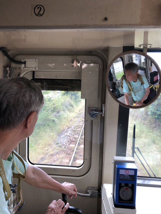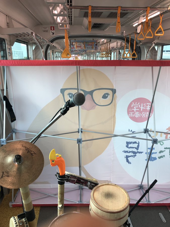 本日はモノレール内でライブ。写真は本番前。この幕が降ろされ演奏。車内は揺れるのでガシッと大股開きで(それでもフラフラしたけど)歌ったりパーカッション叩いたり。車内の子どもたちの周りをまわって鳥の笛も吹きました~♪