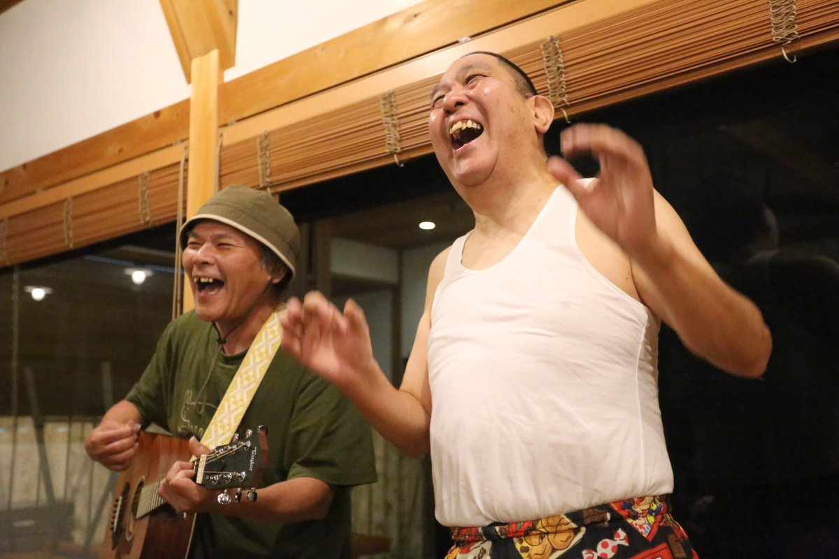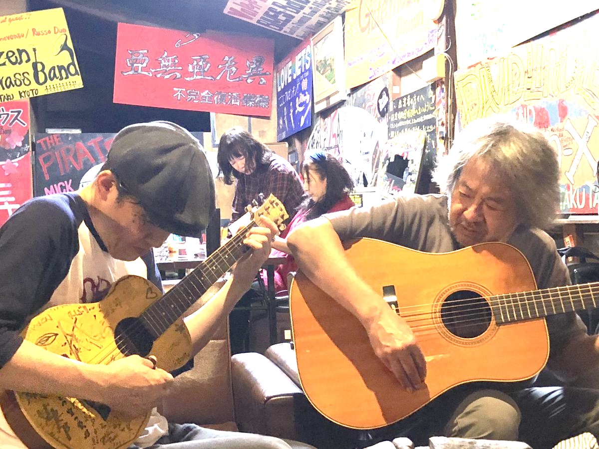 磔磔の楽屋にて、太郎さんにギターの指導を受ける珍しい原くん。