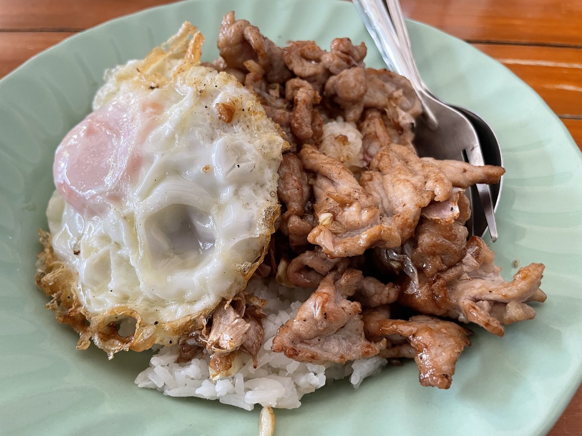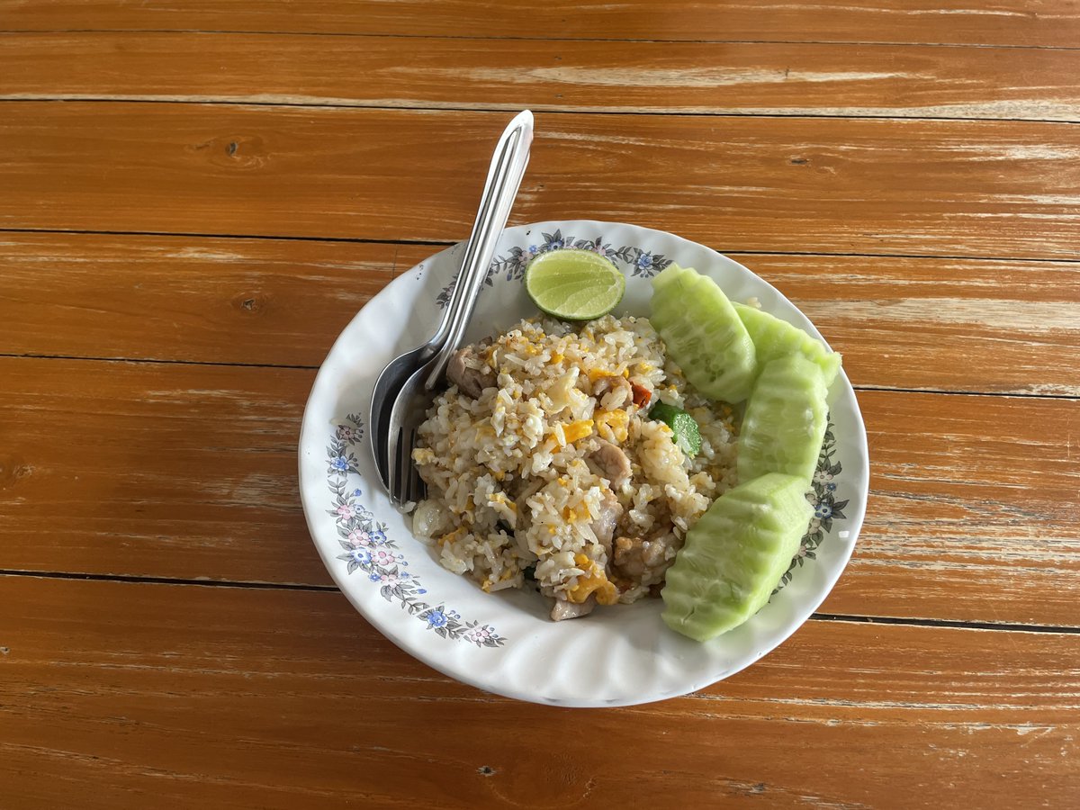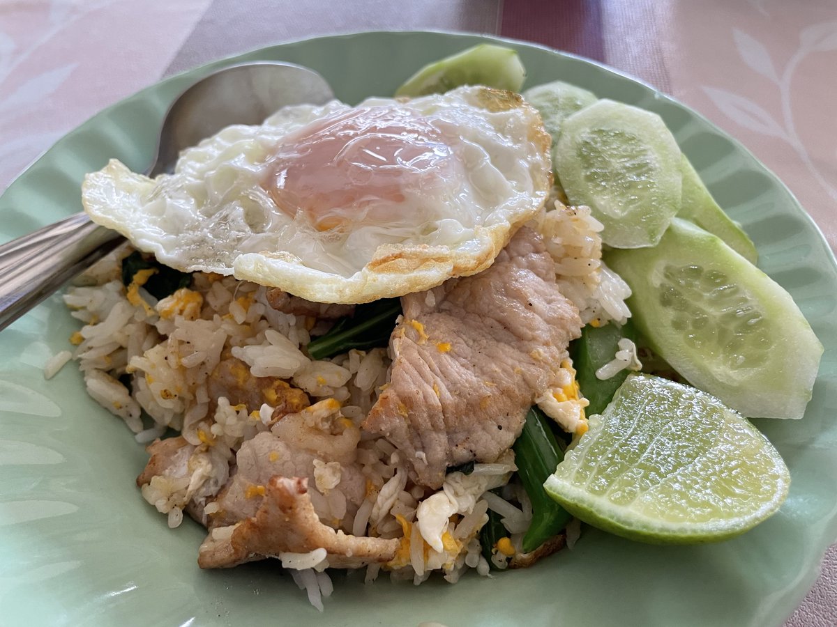 お昼はローカル食堂でシンプルにカオ・パッ・ムー(豚肉チャーハン)。安心のお味。