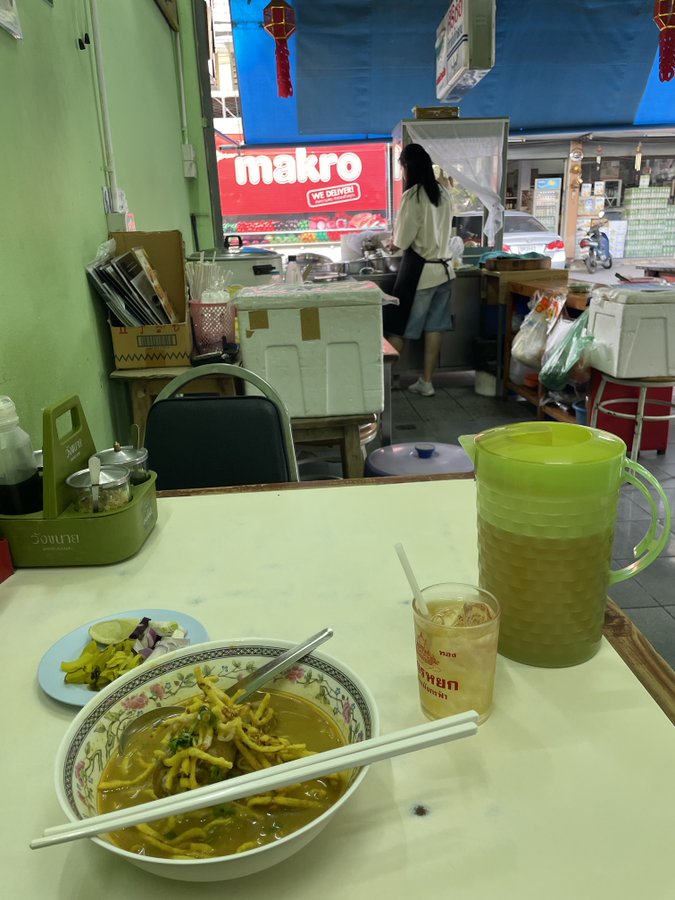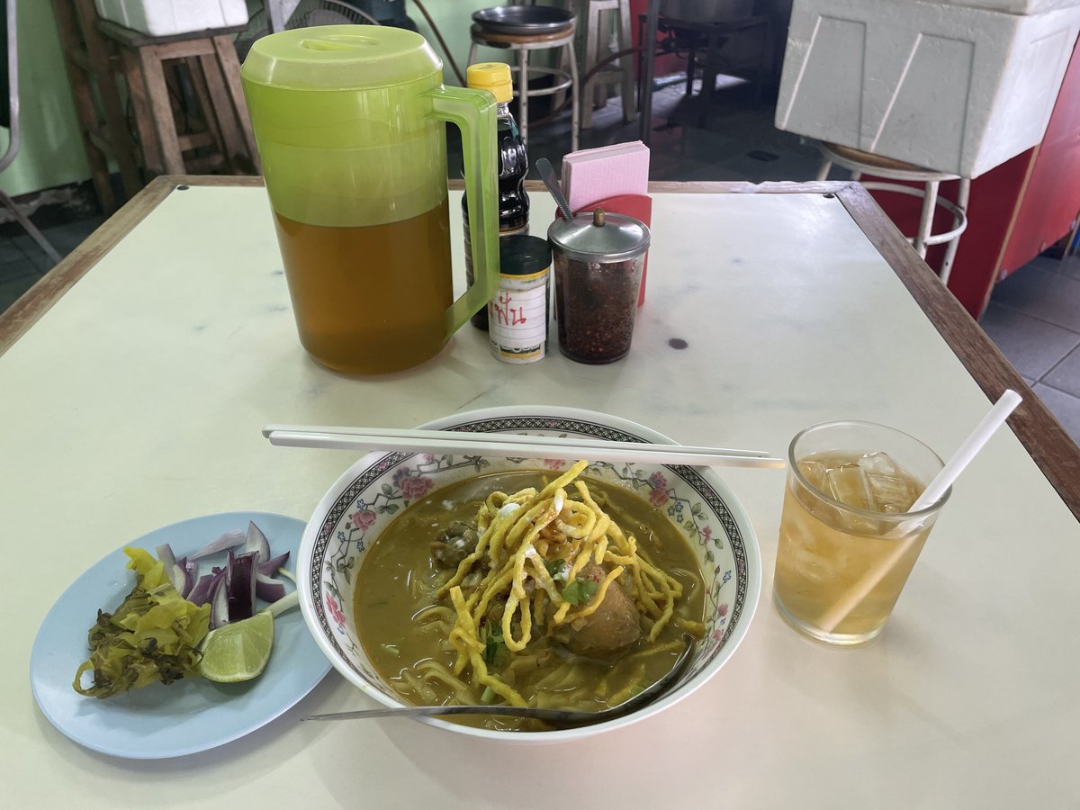 少し早く起きた朝は、6時からやっているこのお店でカオソーイ。氷入りのお茶のサービスも嬉しいね。