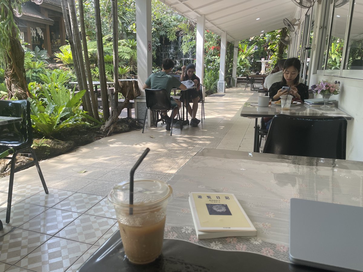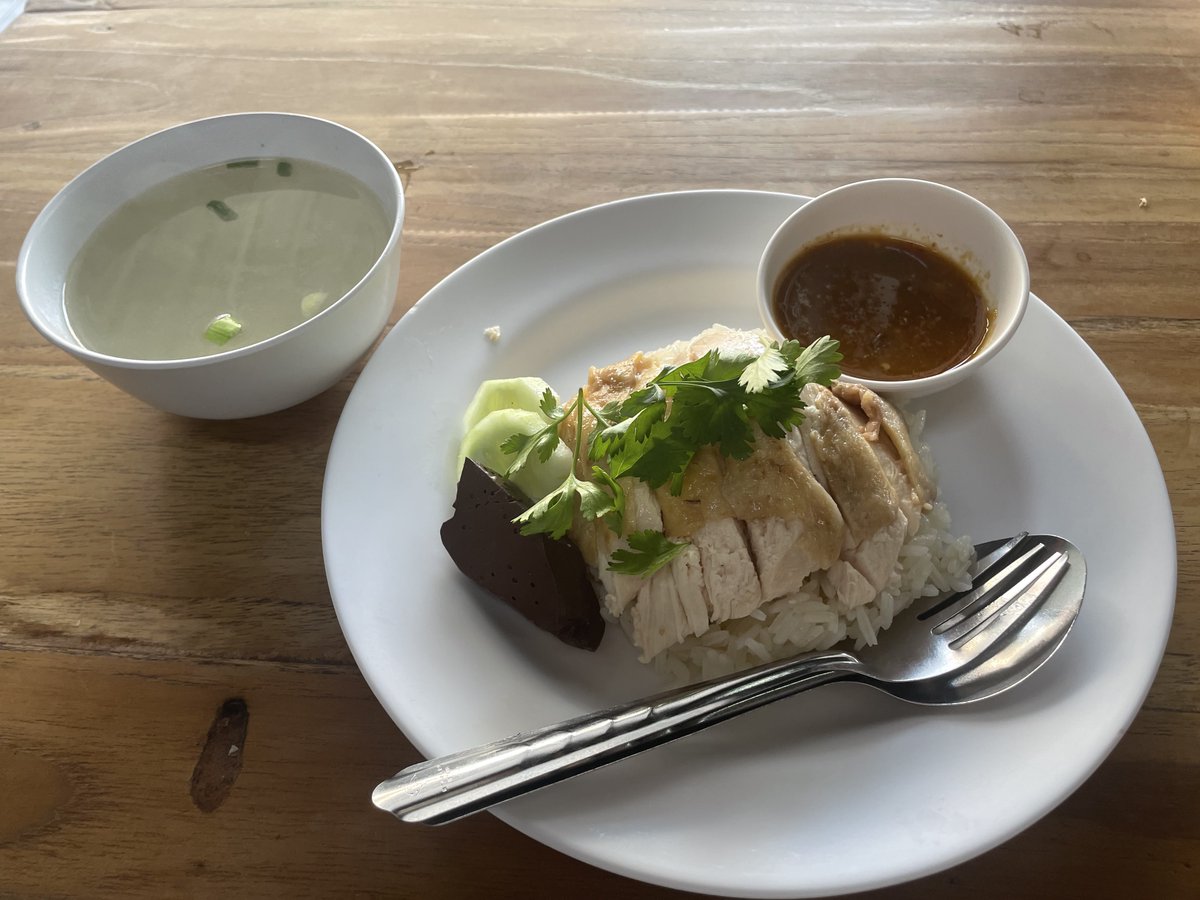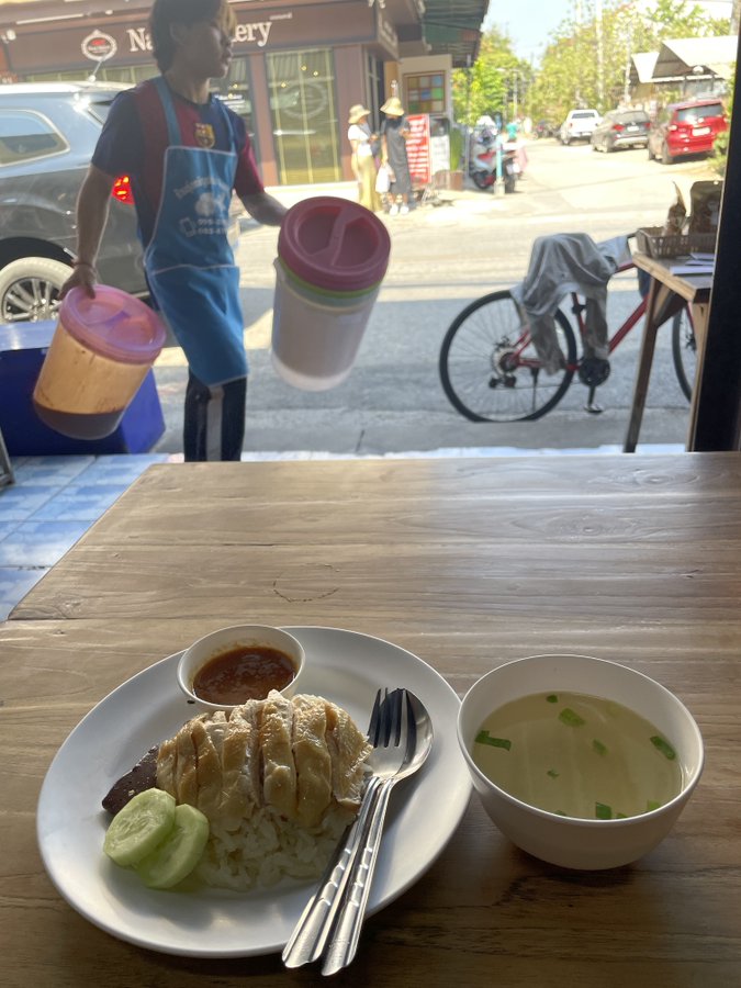 お昼は安心のカオマンガイ。心地良い風とともに。