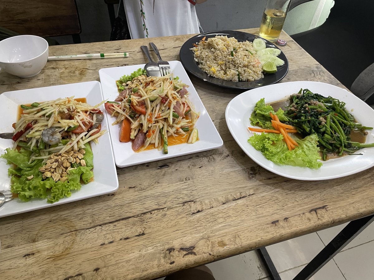 今日の晩飯はローカル食堂で定番のタイ料理。ビール2本ずつ飲んでひとり1000円ちょっと。安い!