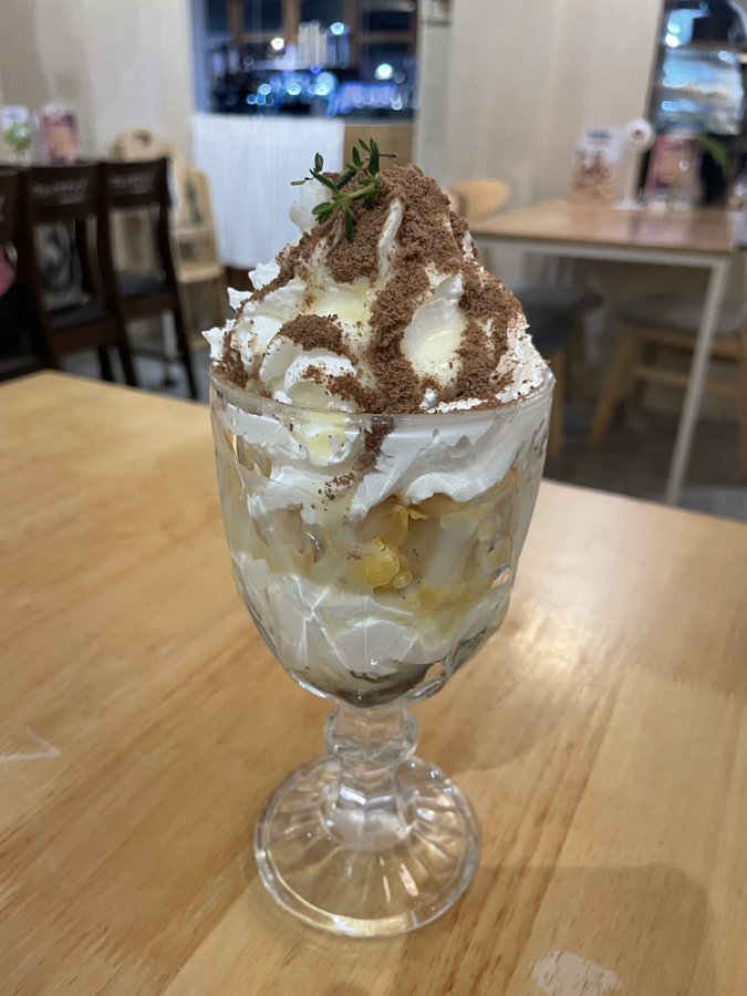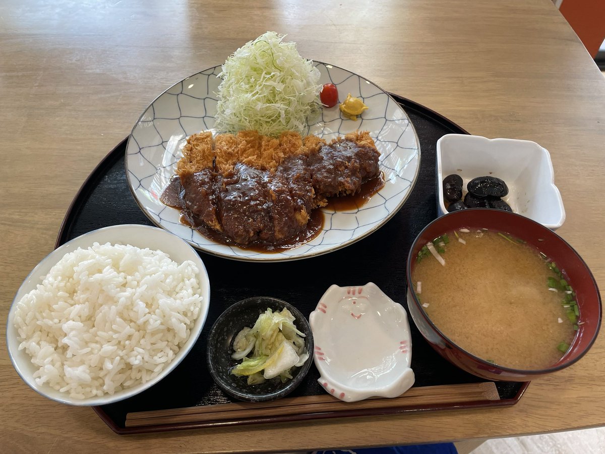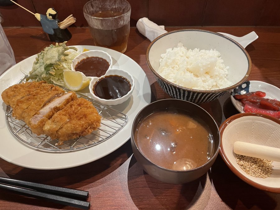 晩飯は友達と。豚カツ定食とパフェ。日本ぽいねぇ。