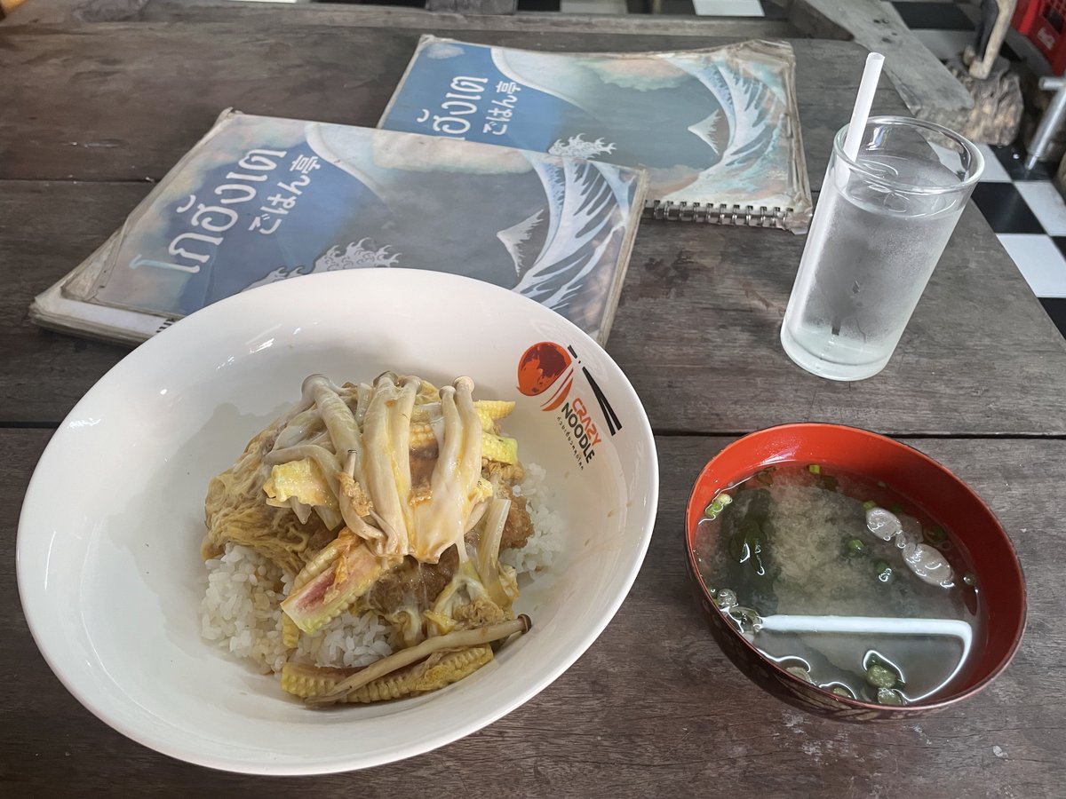 昼飯はカツ丼。卵とじカツの上にエノキとヤングコーンが乗っている。これがタイ風カツ丼なのかな。