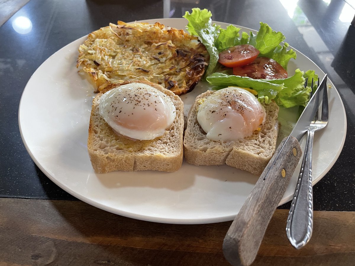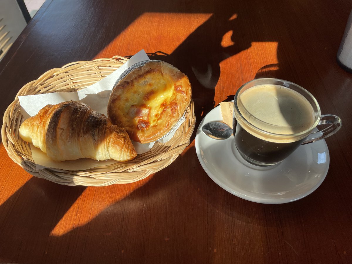 朝食はたまにはアメリカンで。パンは質が良いね(その分、値段も日本並)。