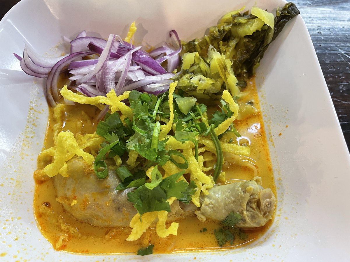 本日のチキンカオソーイ、具沢山。ちなみにスープの上にはバリ麺、スープの中にはやわらかい麺の二種の麺が入ってるのがカオソーイの特徴。