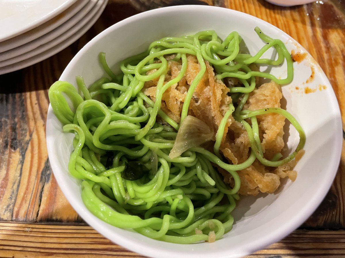 チェンマイのムーガタ(食べ放題鍋屋)でグリーン麺にエノキの天ぷらぶっ込んでミニ天ぷらそばを作ってみました。