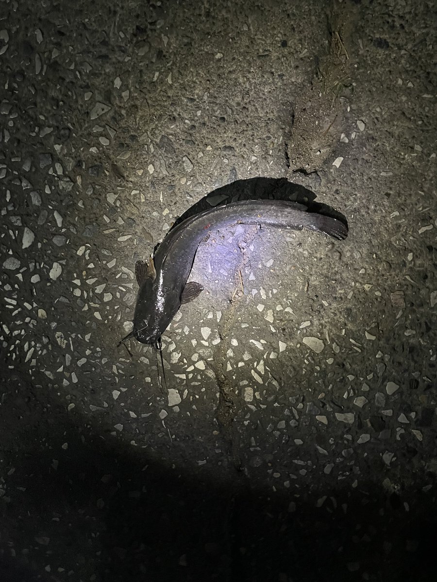 生きてるナマズが夜道に落ちてた。僕が指摘し友達がそこらにあったバケツに入れて近くのドブ川に放流した。