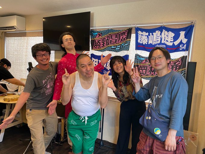 左からジョニー大蔵大臣(水中、それは苦しい)、伊藤こうじさん(元楳図かずおさんらのホームページ制作など)、僕、コスプレ声ちゃん(レジェンドコスプレイヤー、DJ)、原田高夕己先生(「『たま』という船に乗っていた」の漫画家)。